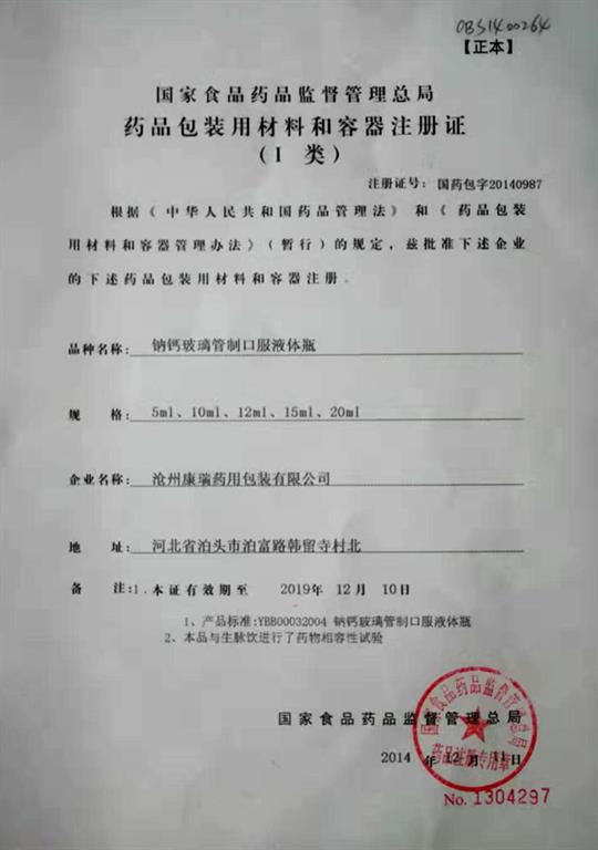 鈉鈣玻璃管制口服液體瓶