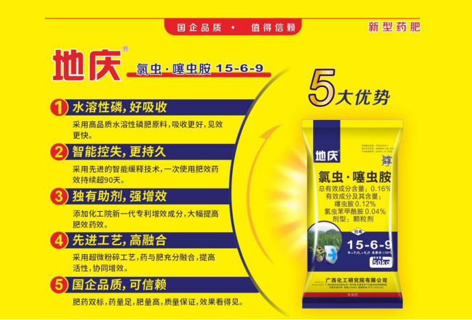 地慶是廣西化工研究院推出的新型高效肥藥兩用的甘蔗地專用藥肥,產(chǎn)品以高品質(zhì)復(fù)合肥為載體的氯蟲苯甲酰胺和噻蟲胺混配制劑,在防治蔗螟、蔗龜、甘蔗粉蚧、蠐螬等甘蔗地上及地下害蟲具有顯著效果,同時(shí)能夠提高蔗苗成活率,促進(jìn)甘蔗幼苗生根,粗芽壯株。藥、肥雙施雙效,省工省力效果好!